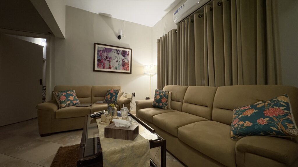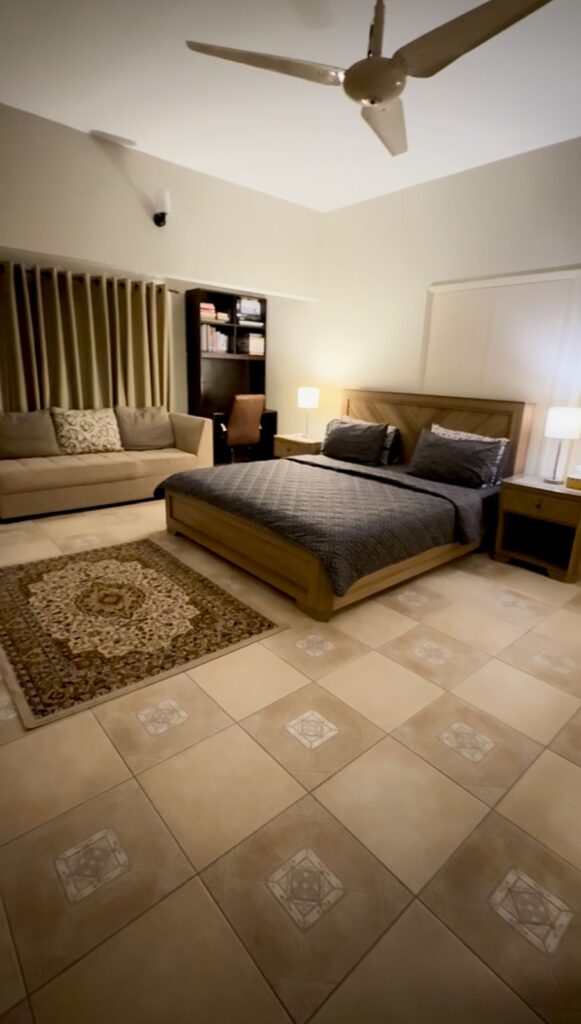 This spacious room features a king-sized bed, en-suite bath & AC. A rare find in Karachi: enjoy access to a lush private lawn, perfect for evening tea. Guests share a stylish lounge & fully equipped kitchen.
